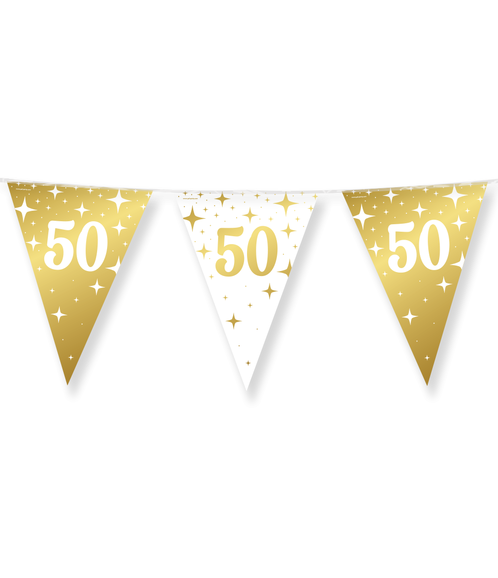 Vier de 50e verjaardag van jouw geliefde in stijl met onze prachtige goud-witte vlaggenlijn! Deze vlaggenlijn is maar liefst 10 meter lang en bestaat uit afwisselende gouden en witte vlaggen, met op elke gouden vlag het cijfer 50 in het wit. De vlaggenlijn is gemaakt van hoogwaardig materiaal en is geschikt voor zowel binnen- als buitengebruik. Hang hem op in de woonkamer, in de tuin of op het balkon en creëer een feestelijke sfeer. De goud-witte kleuren zorgen voor een chique uitstraling en het cijfer 50 maakt het extra feestelijk. Met deze goud-witte vlaggenlijn maak je de 50e verjaardag van jouw geliefde extra speciaal. Bestel nu en maak er een onvergetelijke dag van!
