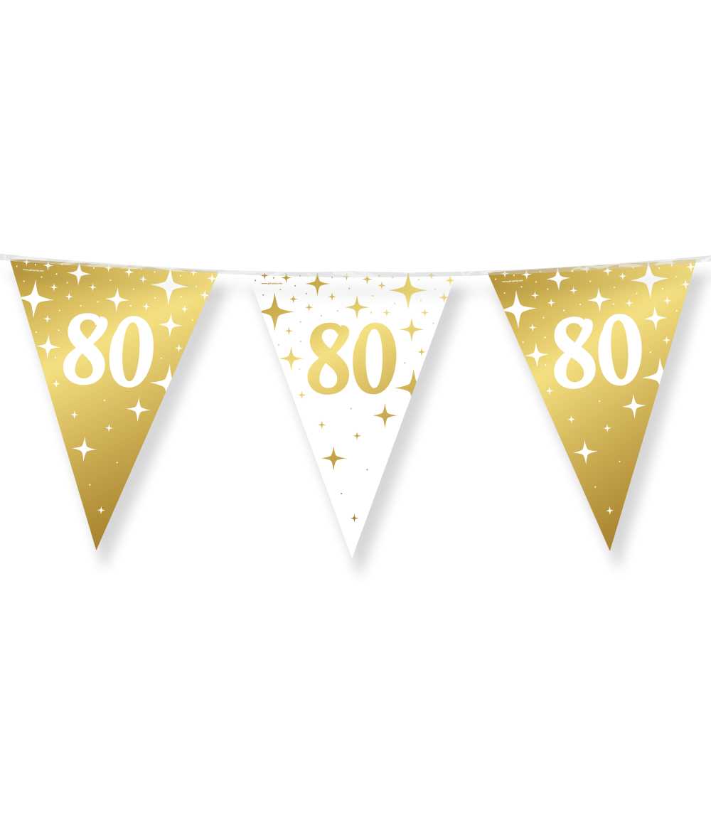 Met deze goud-witte vlaggenlijn maak je de 80e verjaardag van jouw geliefde extra speciaal. Bestel nu en maak er een onvergetelijke dag van!