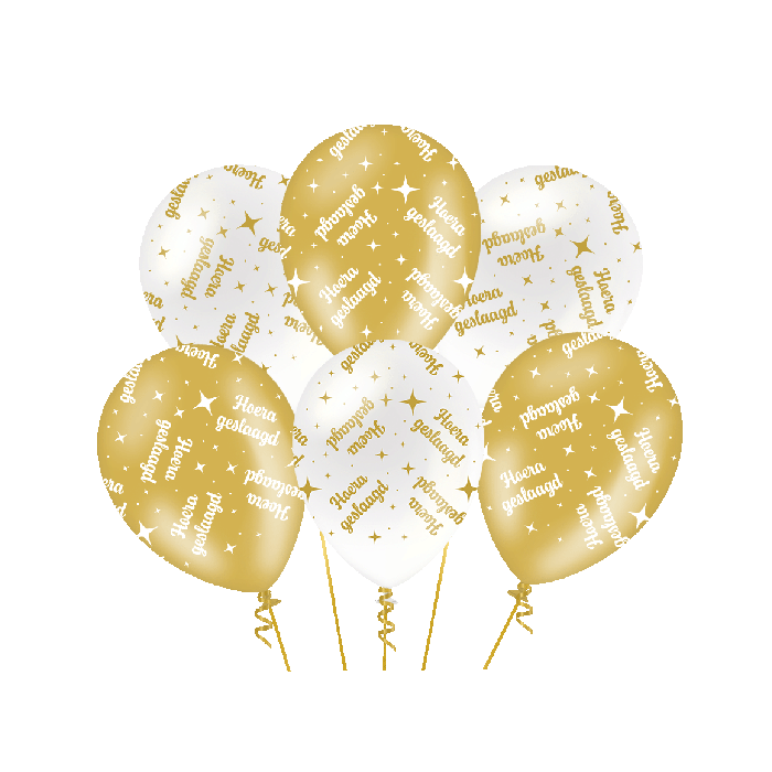 Deze set van 6 ballonnen is perfect om iemand te feliciteren die een belangrijke mijlpaal heeft bereikt. De ballonnen zijn verdeeld in twee kleuren, wit en goud, en elke kleur heeft drie ballonnen. Op elke ballon staat de tekst “Hoera Geslaagd” gedrukt in een opvallend en feestelijk lettertype.