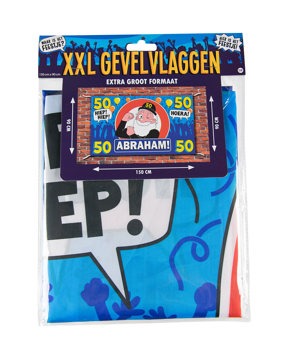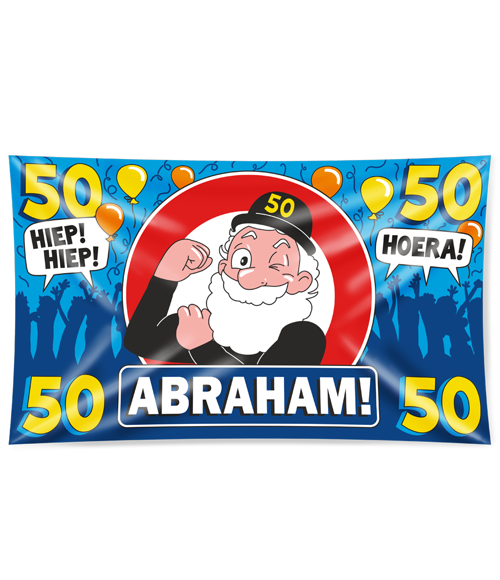 Deze feestelijke gevelvlag is speciaal ontworpen voor iemand die 50 jaar wordt en de mijlpaal van ‘Abraham’ bereikt! De vlag heeft een afmeting van 90 bij 150 cm en is bedrukt met de tekst “Hoera Abraham 50 jaar!” in grote, kleurrijke letters. De vlag is gemaakt van stevig polyester, waardoor hij bestand is tegen wind en regen. Hang deze vlag aan de gevel van het huis van de jarige job om te laten zien dat er een speciale gebeurtenis te vieren is!