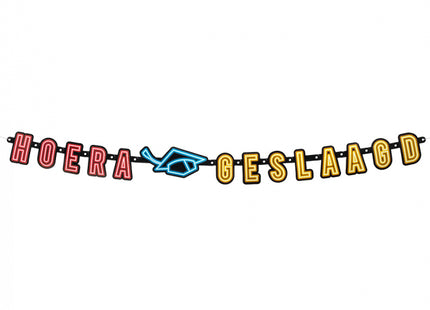 Deze leuke letterslinger van 156 centimeter lang is perfect om te vieren dat iemand geslaagd is! Met de opdruk “Hoera geslaagd” in grote letters is de boodschap duidelijk en feestelijk. De letterslinger is gemaakt van hoogwaardig materiaal en is daardoor geschikt voor zowel binnen- als buitengebruik. Hang de slinger op aan de muur, aan de gevel of boven de feesttafel en maak het feest compleet met deze vrolijke decoratie!