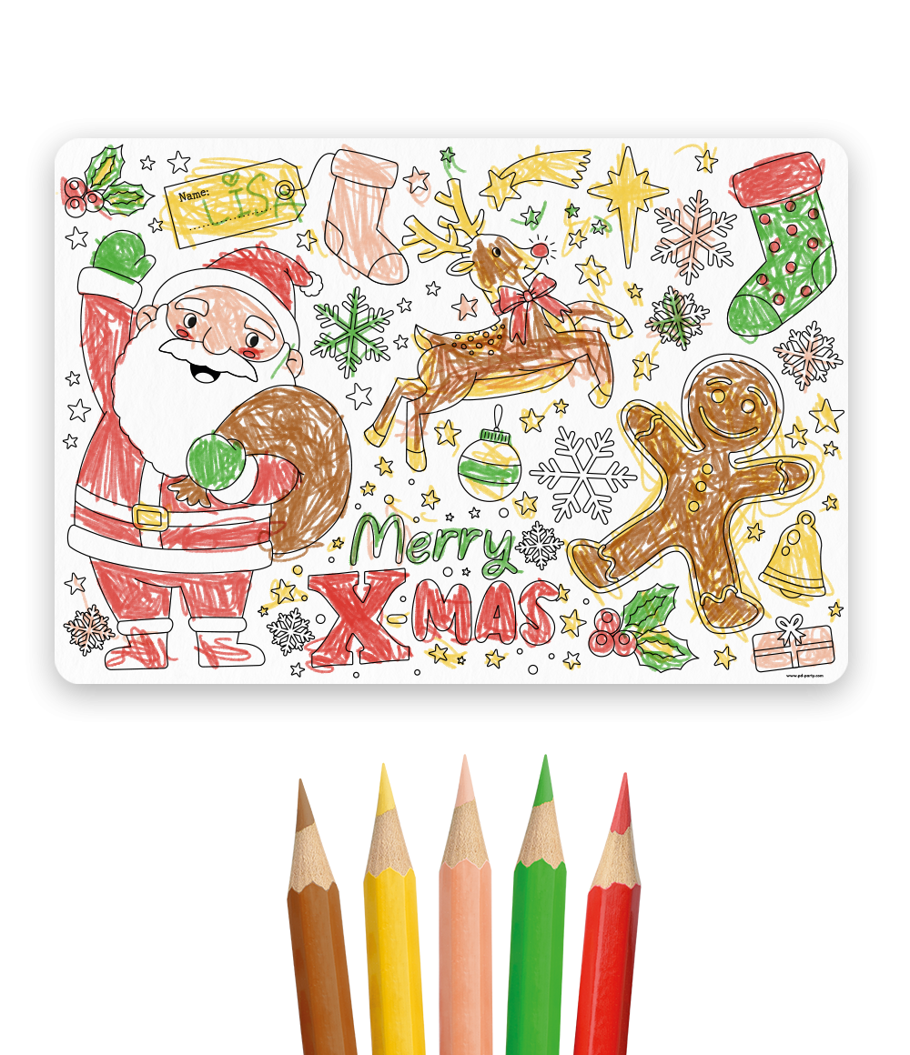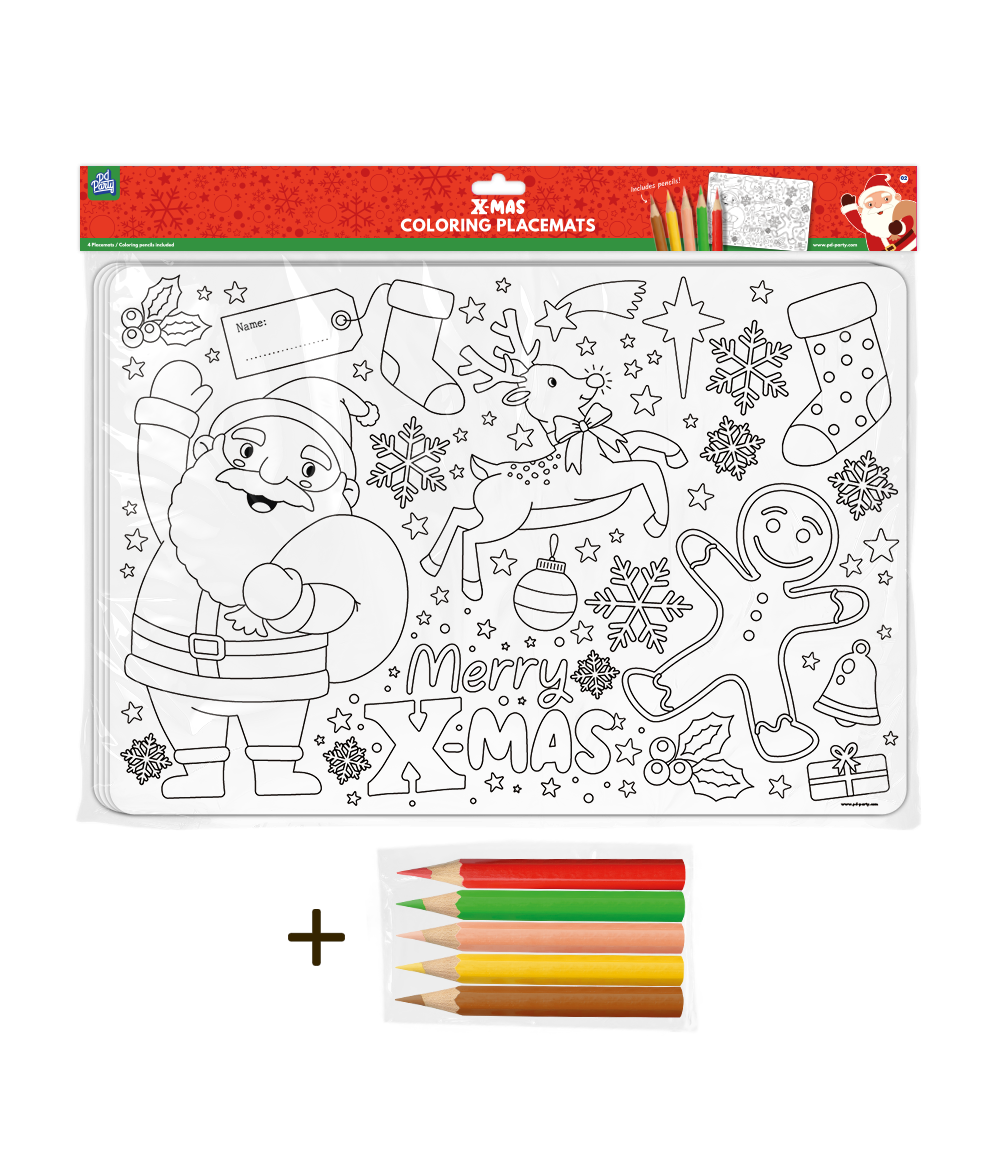 Breng extra kleur en gezelligheid aan de Kersttafel met deze inkleurbare placemats! Elke verpakking bevat vier placemats met vrolijke Kerst illustraties die kinderen zelf kunnen inkleuren, hiervoor worden wat potloden meegeleverd.Bedrijfsmatig grote aantallen bestellen?