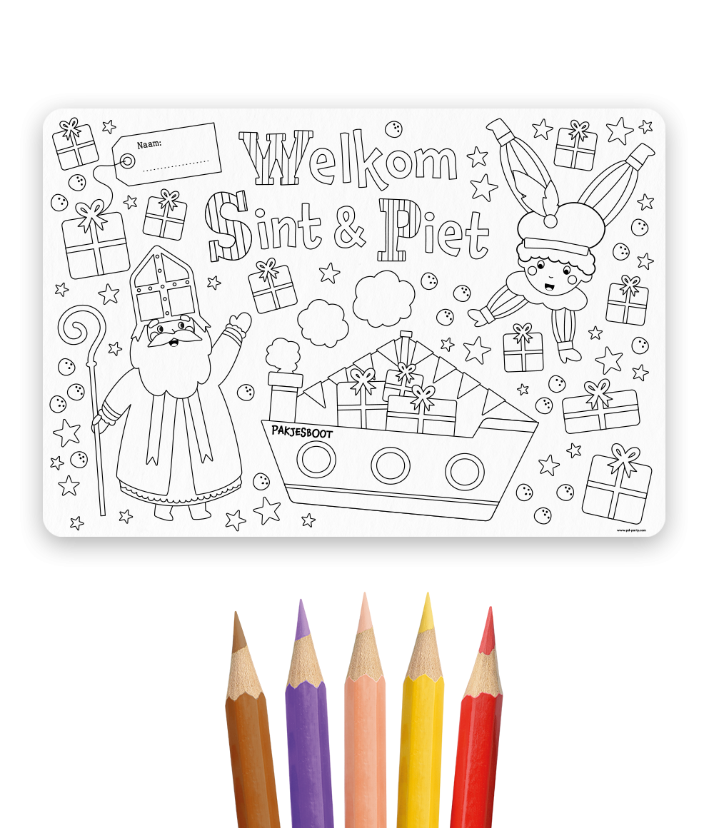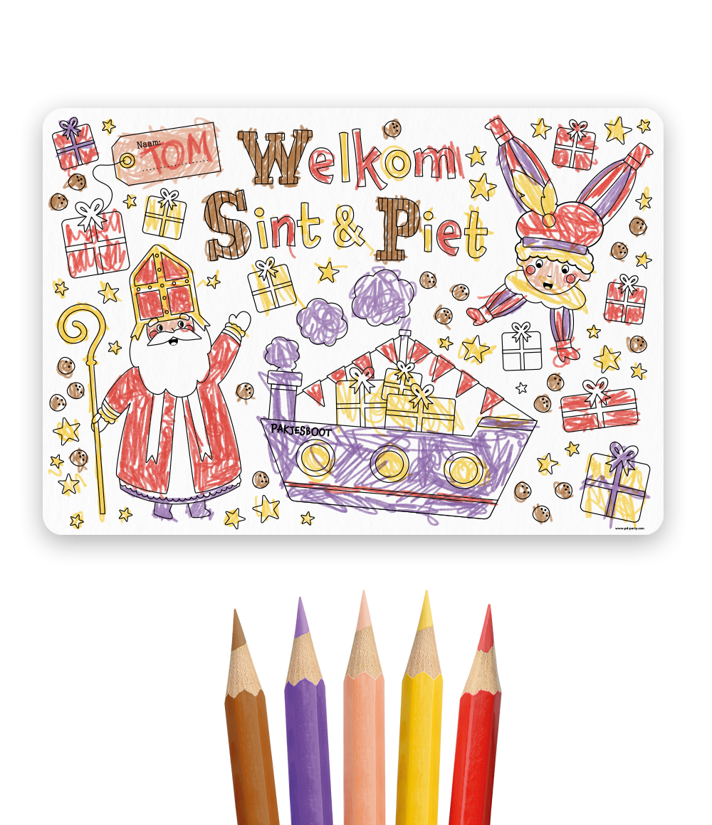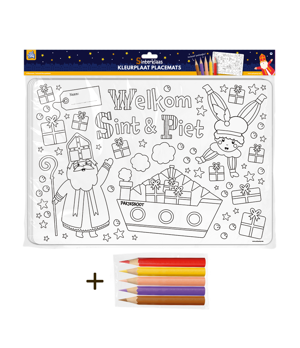 Breng extra kleur en gezelligheid aan de sinterklaastafel met deze inkleurbare placemats! Elke verpakking bevat vier placemats met vrolijke Sinterklaasillustraties die kinderen zelf kunnen inkleuren, hiervoor worden wat potloden meegeleverd.Bedrijfsmatig grote aantallen bestellen?