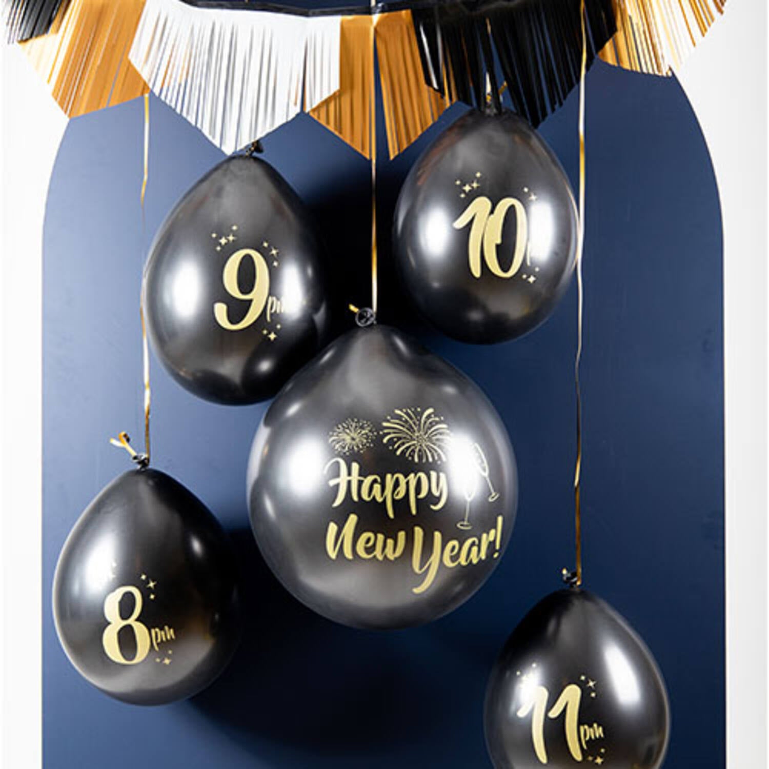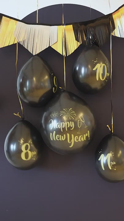 De set bevat 4 latexballonnen van 33 cm met de 24-uursnotaties: 8pm, 9pm, 10pm en 11pm, en 1 ballon van 61 cm met confetti en de tekst 'Happy New Year'. Deze set zorgt voor een leuke toevoeging op elk oud en nieuw feest!