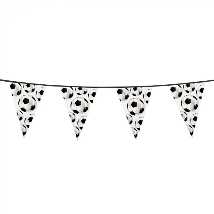 Deze vlaggenlijn met voetbalthema is de perfecte aanvulling op elk voetbalfeest! Met een lengte van 6 meter biedt de vlaggenlijn voldoende ruimte om je feestlocatie op te leuken. De vlaggen zijn gemaakt van hoogwaardig plastic en zijn weerbestendig, waardoor ze geschikt zijn voor binnen- en buitengebruik. Elk vlaggetje heeft een uniek voetbalontwerp. Of je nu een verjaardagsfeestje, een sportevenement of gewoon een leuke verrassing wilt organiseren, deze vlaggenlijn met voetbalthema zullen zeker indruk maken op je gasten! Combineer deze vlaggenlijn ook met onze andere voetbal versieringen voor een sportief feestje.